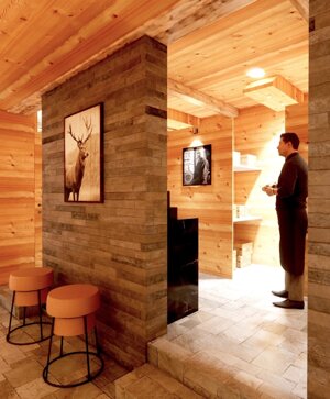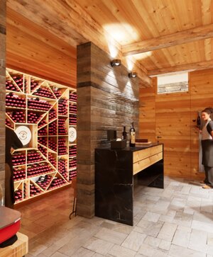 Tutto l'ambiente collabora al piacere del momento. Elementi naturali come la pietra e il legno circondano un mondo di pregiate bottiglie destinate a maturare alla giusta temperatura e umidità. Qui il cliente può degustare i formaggi e i salumi prodotti dai titolari abbinandoli al vino ideale per un'esperienza indimenticabile.