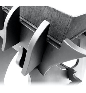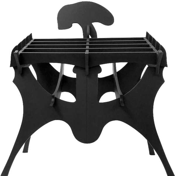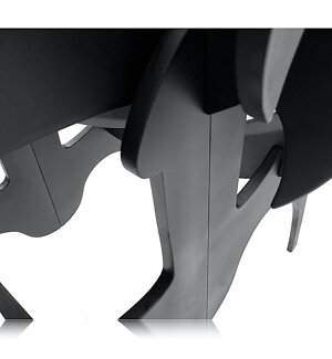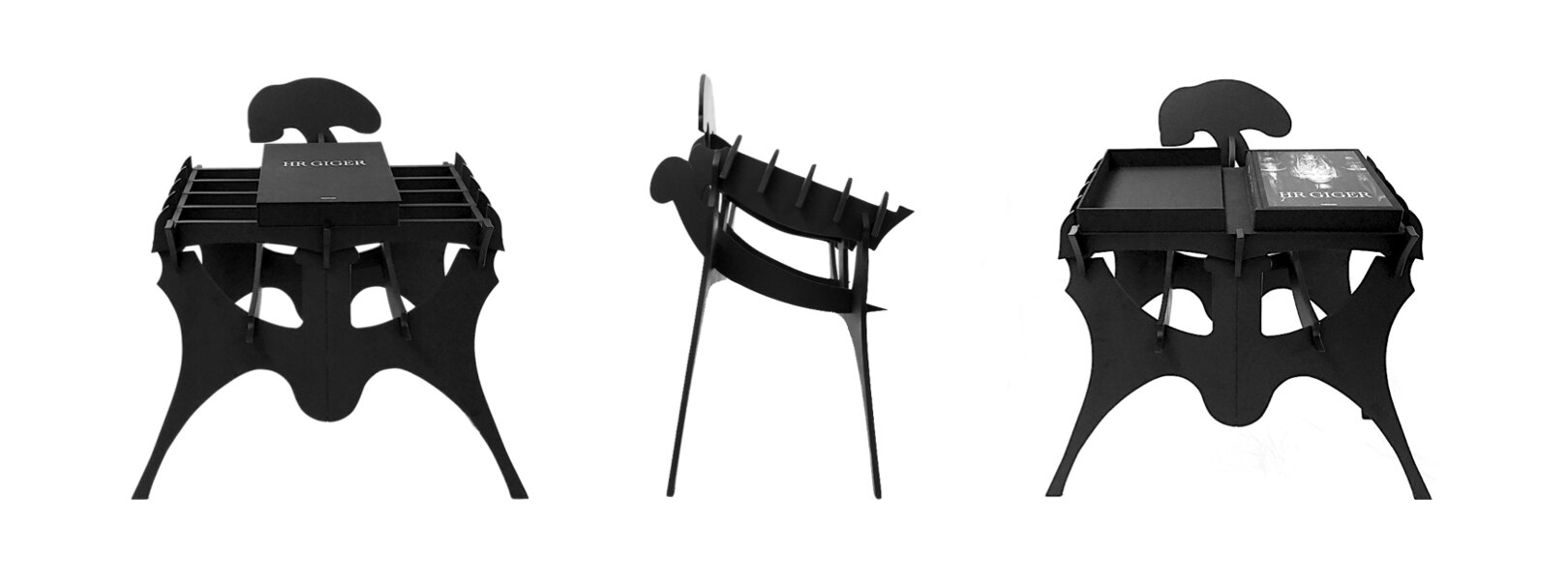 One of the creatures born from the mind of Hans Rudolf Giger that has become universally known is that cute little Xenomorph, a friend of Sigourney Weaver aka Lieutenant Ellen Ripley. Much of the work of the illustrious Swiss citizen has featured beings on the verge of terror, crosses between man and machine that emerge from dark scenarios in which the dominant color is the non-color par excellence: black. All of this I have tried to summarize in the design of a lectern dedicated to the beautiful book by Taschen, elegantly bound by Mauro Loce. A book of significant size that deserves to be kept on display, becoming a protagonist of an environment for many, but not for all. M A