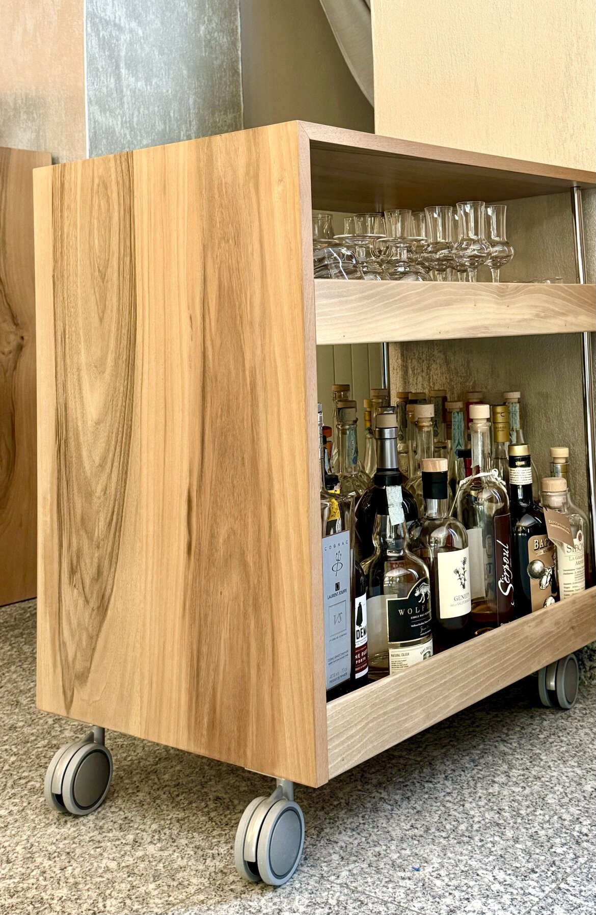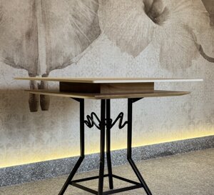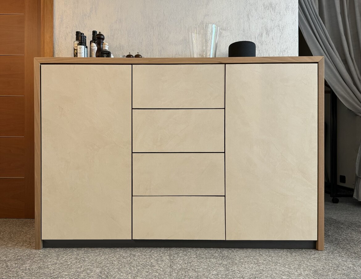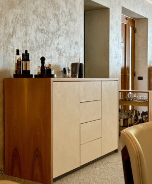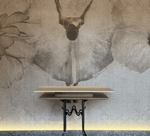 Ideas spring directly from needs. The first stems from a visceral annoyance at seeing piles of cellphones on tables (a gesture that is also light-years away from etiquette and elegance), and the second is more of a feminine nature: where do I put my purse? I solved the first problem by creating a small shelf specifically for storing smartphones first and then any other uncomfortable items in my pockets, such as keys or wallets. For purses, instead, I inserted a decorative element in the central part of the legs that also serves as a purse holder. Wood, Dekton®, and iron. 99% function + 1% creativity.
